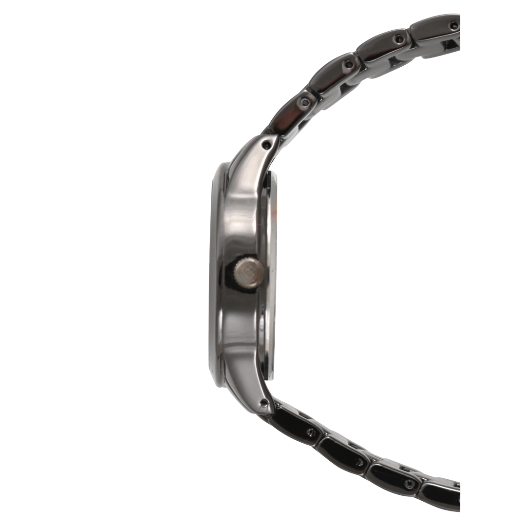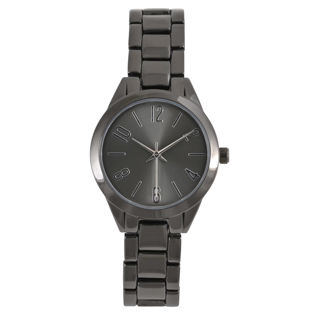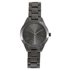 A sleek and modern timepiece that adds effortless sophistication to your look. This women’s gunmetal bracelet watch features a matching round case, sunray dial, and silver Arabic numerals for easy readability. The adjustable link bracelet ensures a comfortable fit, while the all-gunmetal design delivers a polished, contemporary finish perfect for both casual and formal wear.